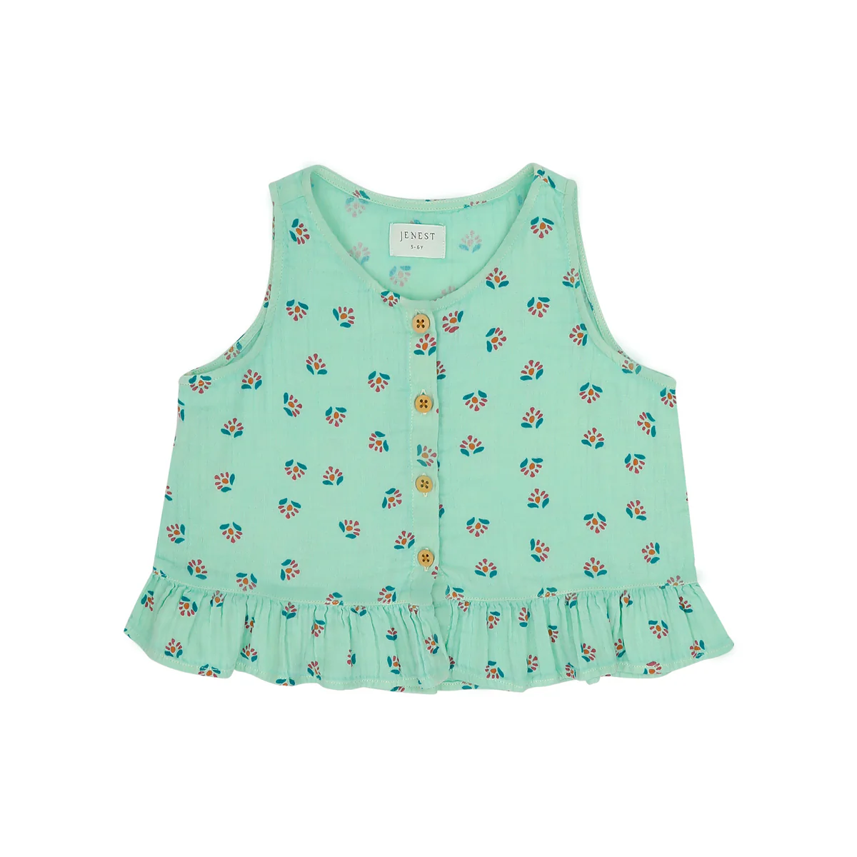 This sleeveless top is crafted from soft lightweight double gauze cotton with an all-over floral print , features a functial center front button-down placket and a ruffled hem.
